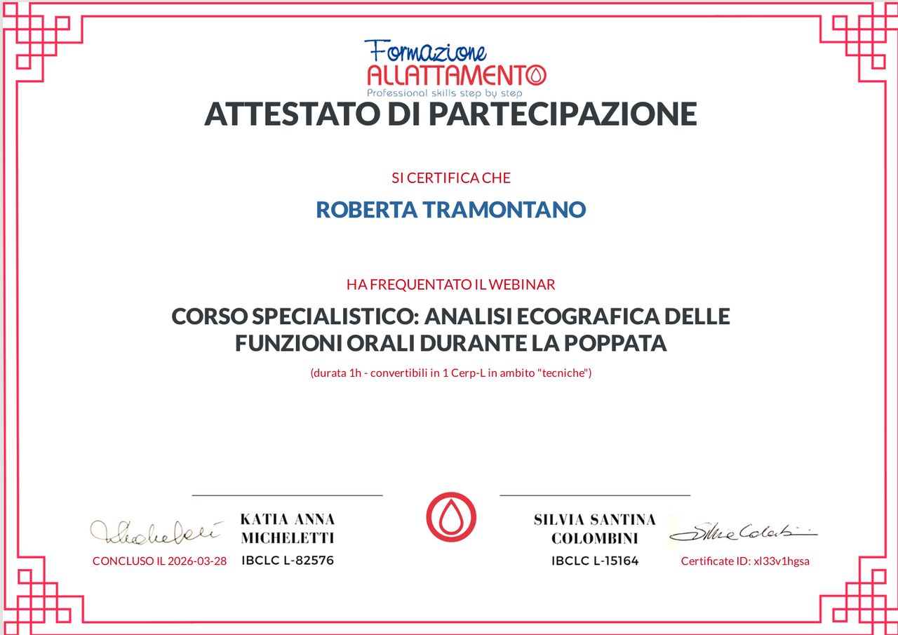 Nata a Napoli nel 1991. Mi laureo con Lode in Medicina e Chirurgia nel 2017, presso l'Università degli studi del Molise. Specialista in Radiodiagnostica con votazione 60/60 e lode, presso l'Università degli studi del Molise. Negli anni svolgo l'attività professionale come Medico in vari ambiti territoriali, dalla medicina generale alla pediatria di libera scelta, provando anche esperienze "diverse" con la medicina penitenziaria. Intraprendo il percorso che mi condurrà al titolo di Consulente Professionale per l'Allattamento Materno (IBCLC) nel 2019, durante l'allattamento del mio primo bambino, che segnerà un cambiamento importante nella mia vita. Negli anni che seguiranno, mi dedico con grande passione al supporto della Diade che allatta, supportando le donne nel territorio Molisano dove vivo attualmente, ma anche online in tutta Italia. Supero con successo l'esame per diventare IBCLC a marzo 2023 (certificazione numero L-311106), conseguendo il titolo che mi renderà la prima Consulente Allattamento in Molise. Nel 2024 completo con successo il corso di formazione SIFAM per il riconoscimento delle restrizioni orali, il frenulo linguale e labiale restrittivo. Attualmente mi occupo della diagnosi e del trattamento del frenulo linguale e labiale restrittivo mediante frenulotomia con forbici o elettrobisturi, effettuata presso centro polispecialistico a Campobasso. Autrice dei libri "Allattare...oltre i confini del nutrimento" e "Come termina l'allattamento?" Attualmente offro il mio aiuto a migliaia di donne in tutta Italia e in Molise. Ho allattato a termine i miei due bambini. La maternità è parte fondamentale del mio approccio lavorativo, mettendo l'empatia al primo posto in ogni consulenza. Conoscenza, passione ed esperienza personale mi accompagnano in ogni giorno al fianco delle Donne che scelgono di affidarsi a me. Le problematiche affrontate sono innumerevoli, tra le più richieste: -Deficit di attacco al seno -Rimozione paracapezzoli -Ipoproduzione lattea -Vesciche di latte -Ritorno ad allattamento esclusivo -Dotti ostruiti -Vasospasmo -Mastite -Interruzione allattamento -valutazione della compatibilità dei farmaci -anchiloglossia -restrizioni orali (frenulo labiale e linguale restrittivo) Inoltre, ho conseguito Diploma SIUMB di ecografia pediatrica e neonatale e svolgo ecografie internistiche al bambino e all'adulto appoggiandomi a vari poliambulatori in Molise.